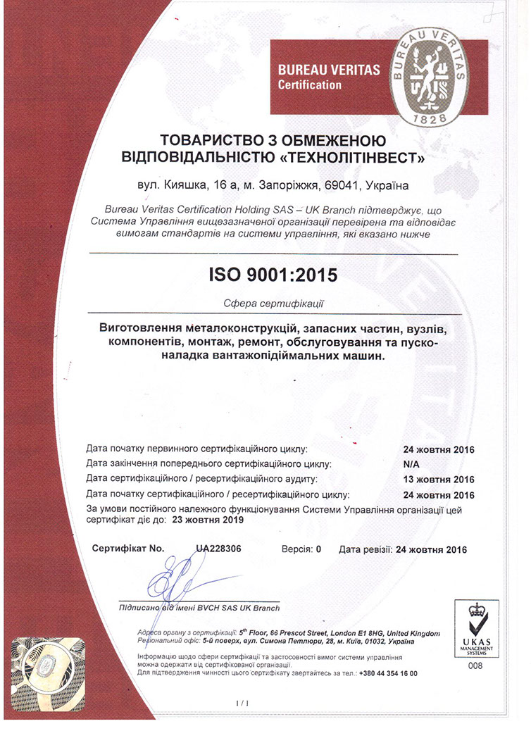 October 24, 2016 on the results of the certification audit, the company «Bureau Veritas» recommended Company "Tehnolitinvest" to obtain the certificate for compliance with international standard ISO 9001.